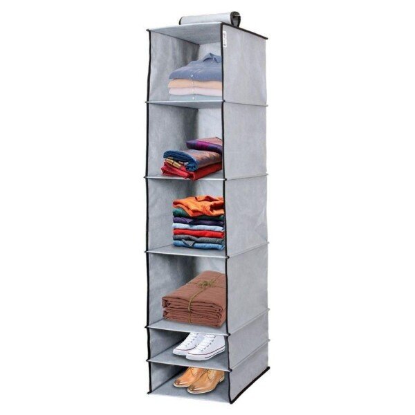 Product Description: Foldable Hanging Wardrobe Organizers is comprised of 6 roomy, easy-access shelves that allow ample room for storing and organizingPackage Contains: It has 1 Piece of 6 Shelves Hanging OrganizerMaterial: Non-WovenProduct Dimension ( L x W x H in cm ): 10 x 12 x 43Product Weight: 996 gmFeatures: -Closet Hanging Shelf Organizer makes the process much easier and actually adds more hanging space to your closet! The organizer is comprised of 6 roomy, easy-access shelves that allow ample room for storing and organizing!
