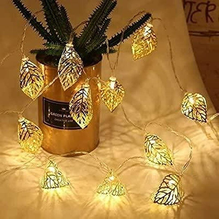 Metal Leaf LED Light 16 lamp, Light for DecorationAdd a touch of elegance to your decor with the Metal Leaf LED Light. This set includes 16 LED lights that can easily create the romantic ambiance you desire. Whether you want to decorate your home, room, garden, or tree, these lights are the perfect choice.The Retro Rose Moroccan LED String Lights are not only suitable for home decor but also ideal for events. They are often used at weddings, on patios, in cafes, bistros, and clubs. These lights come in a pack of 1, making it convenient for your decoration needs.Package Contains: 16 pieces of LED LightCombo/Set Of: Pack of 1Enhance your Diwali decoration and puja setup with our wide range ofLightning Products.