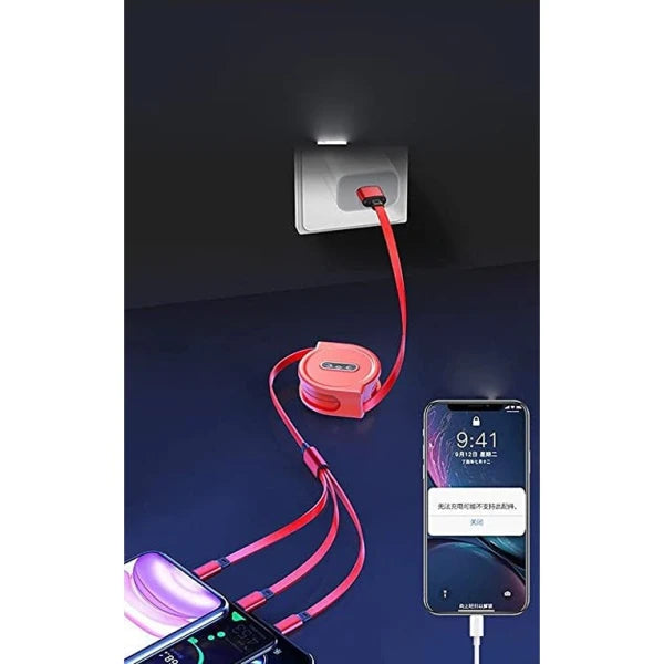 Multiple Charging Cable 4Ft/1.2m 3-in-1 USB Charge Cord CompatiblePackage Contains: 1 piece of 3-in-1 USB Charge Cord CompatibleMaterial: Plastic and RubberColor: Color as per availabilityCombo/ Set Of: Pack of 1Weight: 150Additional InformationOne for All: Charge any of your devices with the 3-in-1 retractable charging-cable, built-in Micro USB, USB-C, and iOS connectors. Charge any of your devices with the 3-in-1 retractable charging-cable, built-in MicroUSB, USB-C, and iOS connectors.No need to carry any other cables when you are in a car, office, traveling or house guests, it was created exclusively for the purposes of convenient charging several devices simultaneously or individually.